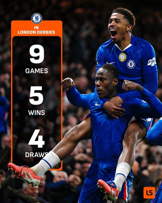近9场伦敦德比,切尔西有着骄人的战绩,他们5胜4平保持不败。